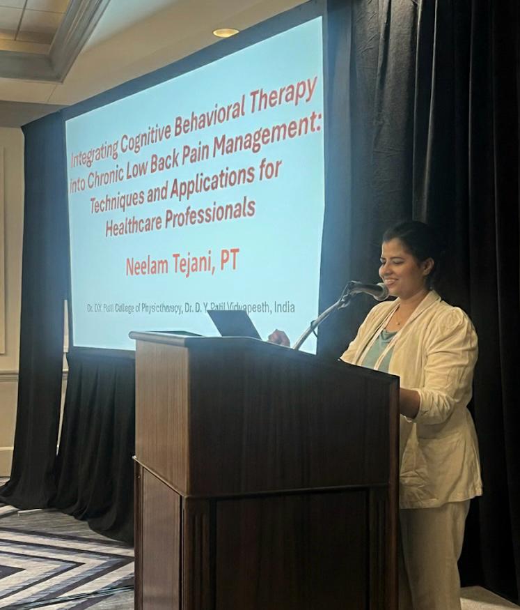 Dr. Neelam Tejani presented her research paper titled "Effect of Mindful Breathing Technique on Pain and Neck Disability Index in Desk Job Workers with Chronic Neck Pain” and as a presenter for IC 8 on “Integrating CBT into Chronic Low Back Pain Management” at the ACRM 102nd Annual Conference, Chicago from 25th to 31st October, 2025.